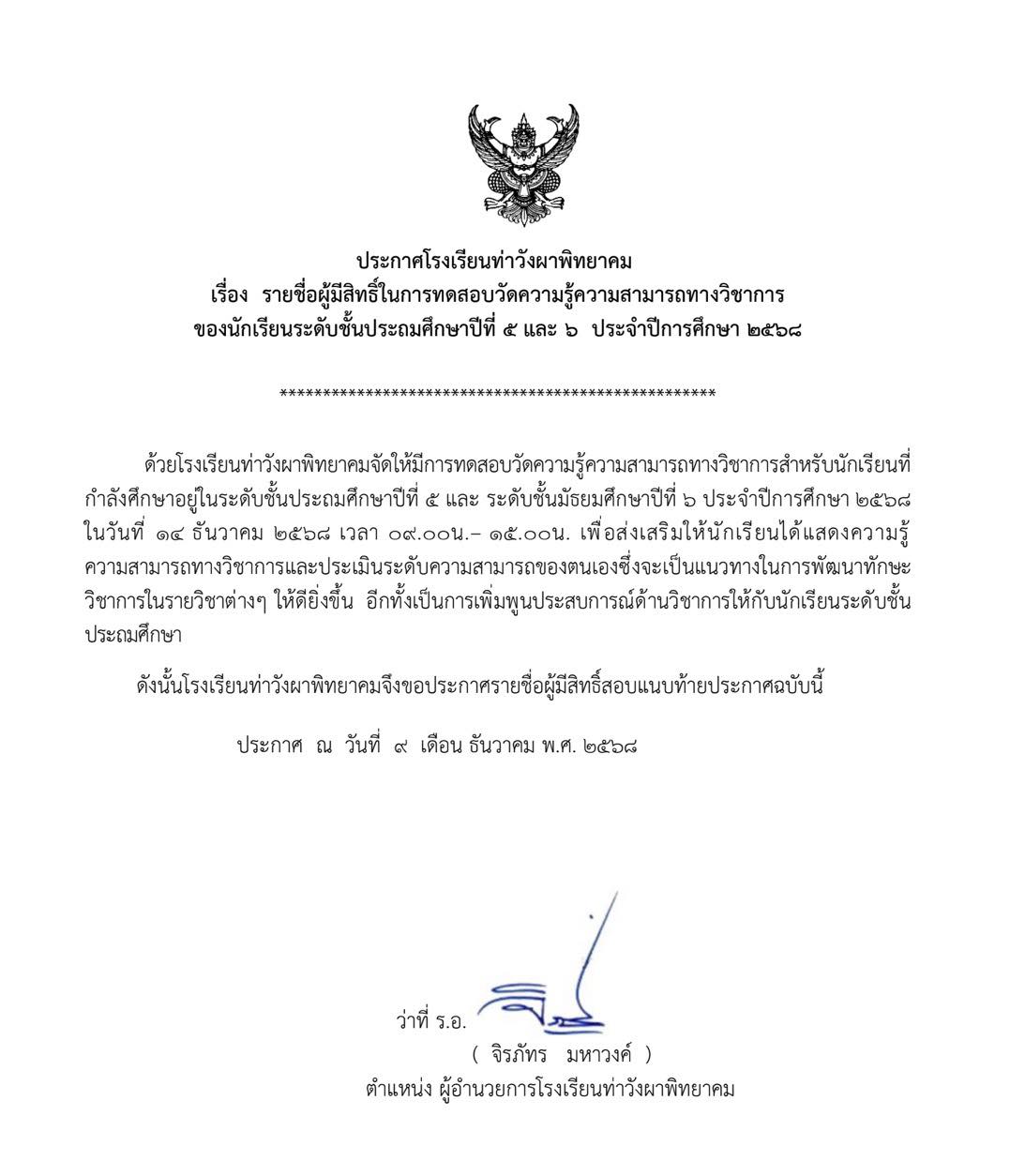 ประกาศรายชื่อผู้มีสิทธิ์สอบวัดความรู้ความสามารถทางวิชาการ ระดับชั้นประถมศึกษาปีที่ 5 - 6 ปีการศึกษา 2568