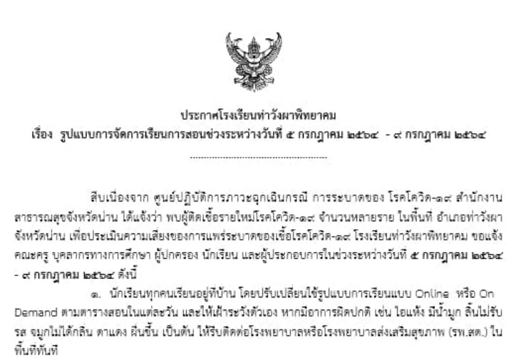 ประกาศ โรงเรียนท่าวังผาพิทยาคมเรื่อง รูปแบบการจัดการเรียนการสอนในสถานการณ์แพร่ระบาดของโรคติดต่อเชื้อไวรัสโคโรน่า 2019(COVID-19) วันที่ 5 กรกฎาคม – 9 กรกฎาคม 2564รูปแบบการเรียนแบบ Online หรือ On Demand