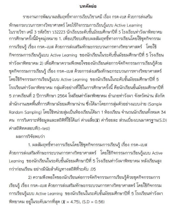 รายงานการพัฒนาผลสัมฤทธิ์ทางการเรียนวิชาเคมี เรื่อง กรด-เบส ด้วยการส่งเสริมทักษะกระบวนการทางวิทยาศาสตร์ โดยใช้กิจกรรมการเรียนรู้แบบ Active Learning ในรายวิชา เคมี 3