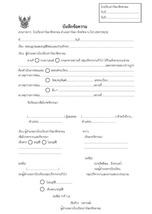 เอกสารขออนุญาตและอนุมัติซ่อมแซม ดาวน์โหลดเอกสารขออนุญาตและอนุมัติซ่อมแซม ดาวน์โหลดเอกสารที่นี่ แบบบันทึกข้อความขออนุญาตซ่อมแซมDownload